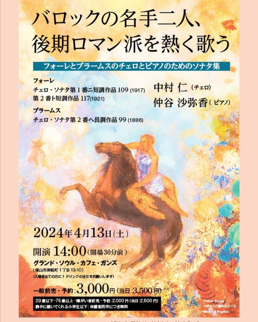 今月2回目の演奏会は、中村仁さんのチェロと仲谷沙弥香さんのピアノによるフォーレとブラームスのチェロとピアノのためのソナタ。